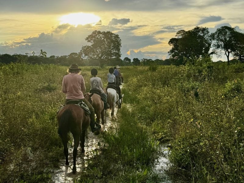 Vanuit Baiazinha Lodge ben ik doorgereden naar Araras Ecolodge, deze lodge ligt ook in het noorden van de Pantanal, een mooie route van 5 uur langs de grenzen van dit unieke biotoop. Het verblijf is hier niet zo zeer gericht op het zien van de jaguar. (Alhoewel het wel mogelijk is om hier een zeer prijzige bootexcursie naar de Porto Jofre rivier voor de jaguar bij te boeken incl. 4 uur heen en 4 uur terug.) Hier moet je verblijven als je het natte deel van de Pantanal en zijn unieke dierenleven wilt ervaren in het comfort van een goed georganiseerde, kleinschalige 3-4 sterren lodge. Er zijn verschillende torens en vlonderpaden aangelegd, je kunt kanoën, paardrijden en op game drive gaan, ook ‘s nachts….. Het is de beste plek om brulapen en kapucijnapen in de Pantanal te spotten, deze laatsten waren al voor ons op de uitkijktoren bij zonsondergang…. Ook de reuzenotter wordt van juli t/m oktober vrijwel altijd gespot tijdens het kanoën. Wie wil er nu niet zo door het water paardrijden, op deze schatten van paarden?