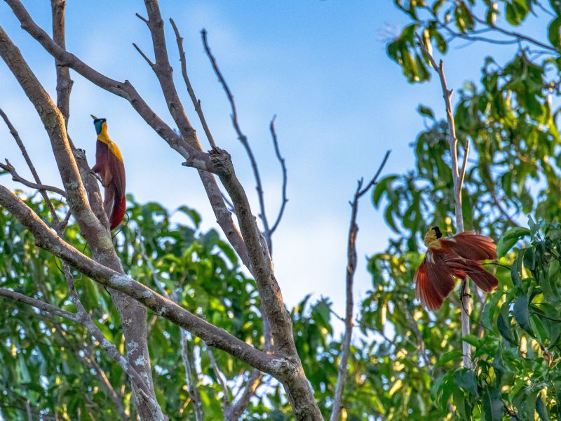 Voor de paradijsvogels hebt u meer meer geluk nodig, maar zowel de gewone-, de rode- en de Wilsons paradijsvogels komen hier voor. Geen enkele andere vogelfamilie is zo mooi of zo rijk aan diversiteit in verenkleed en baltsgedrag als de flamboyante paradijsvogels, waarvan er 43 soorten zijn, variërend van de grootte van een spreeuw tot de grootte van een kraai, waarbij bepaalde soorten staarten hebben van wel een meter lang.